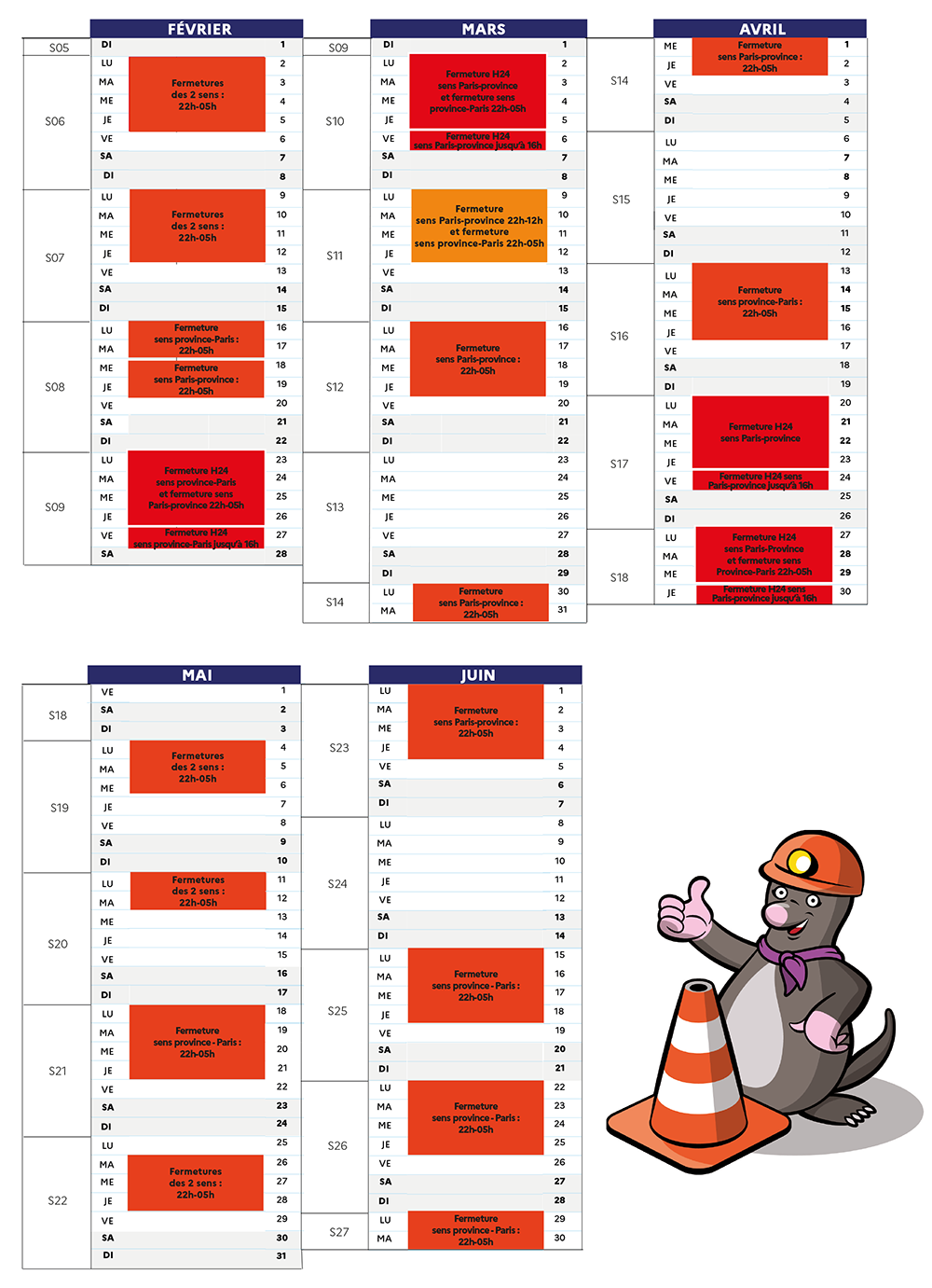 Ce type de fermetures, bien que contraignantes pour les usagers, va permettre de gagner presque un an sur la durée totale du chantier au regard de l’ampleur des travaux à mener et de réduire ainsi les impacts du chantier sur la circulation.